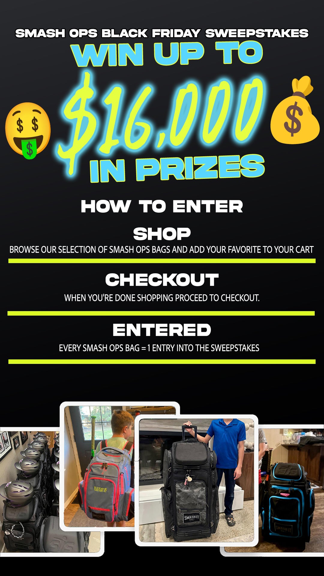 No, But there is a secondary way to enter and win a $1,000 Smash It Sports Gift Card. Post a photo of your Smash Ops Bag on social and tag @SmashItSports with #OpsSweepstakes to earn a bonus entry.